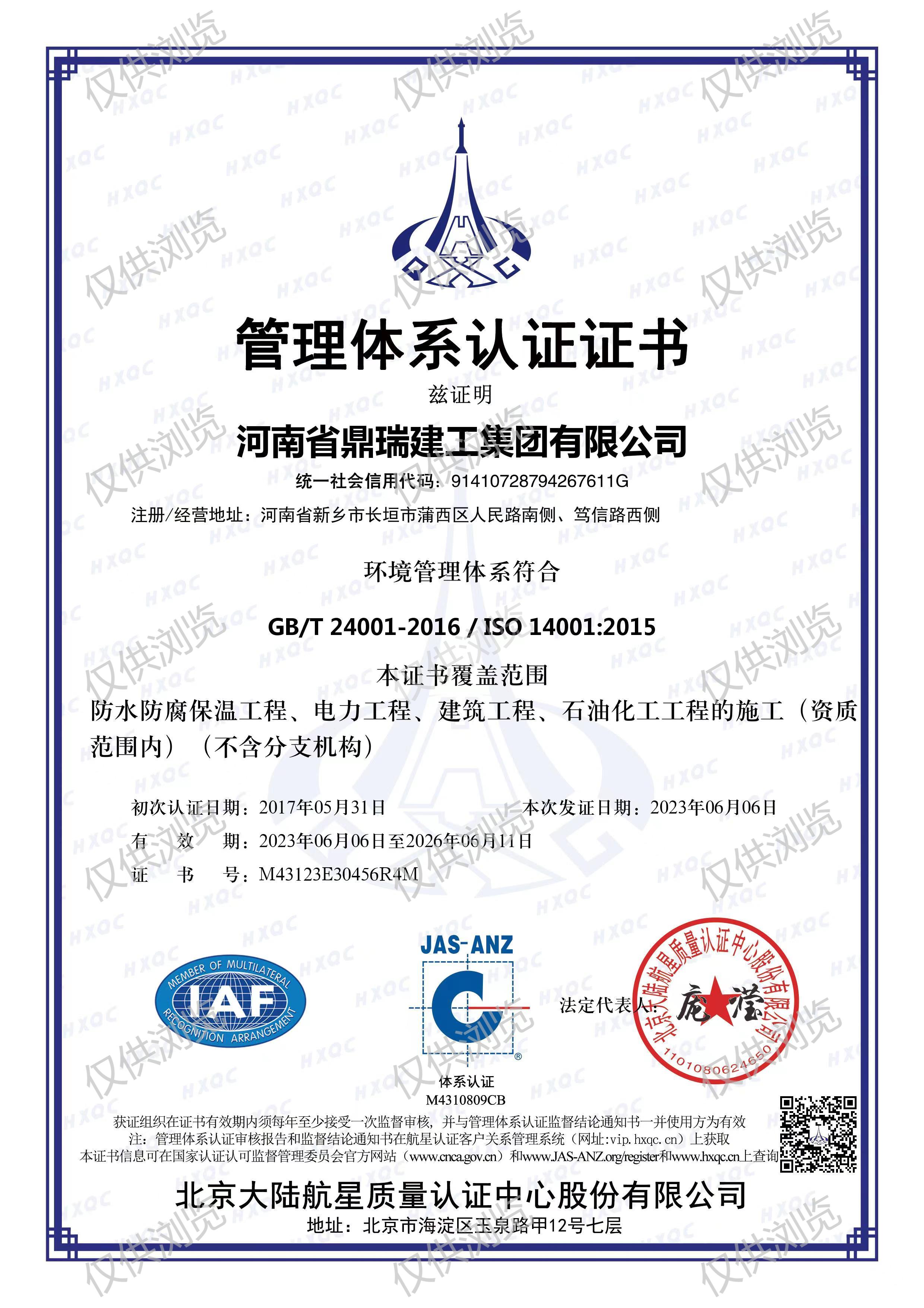 環(huán)境管理體系認(rèn)證證書